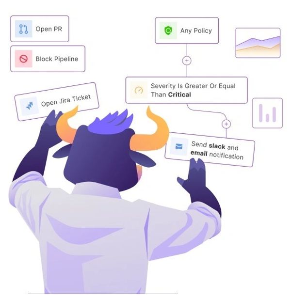 Remediation Automatica e Workflow No-Code: Semplifica le attività di remediation grazie a un’interfaccia drag-and-drop, automatizza la generazione di ticket e notifiche, e applica policy per mantenere la sicurezza in produzione. Gli utenti possono creare workflow no-code che attivano azioni automatiche come l’apertura di un ticket o di una pull request per problemi specifici, il blocco delle merge fino alla risoluzione del problema e l’abilitazione della protezione dei branch nei repository critici.